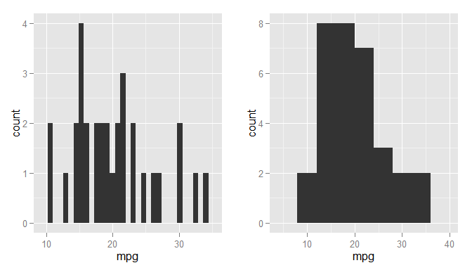 > q <- ggplot(mtcars, aes(x = mpg)) + geom_bar(stat = "bin", binwidth = 4)