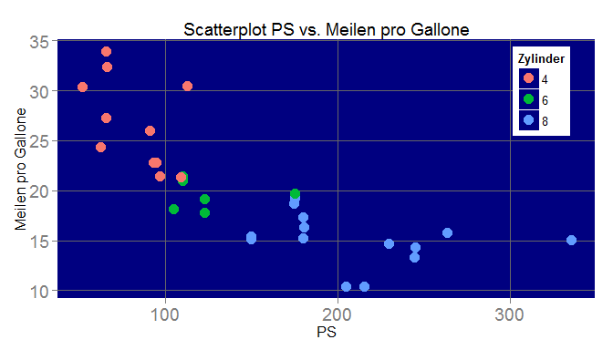 + labs(x = "PS", y = "Meilen pro Gallone", color = "Zylinder")