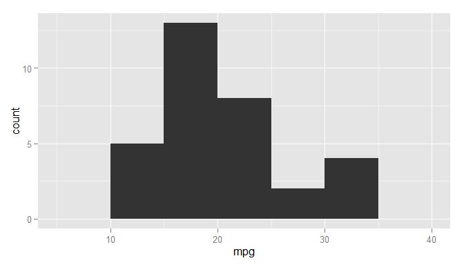 > ggplot(mtcars, aes(x = mpg)) + geom_histogram(binwidth = 5)