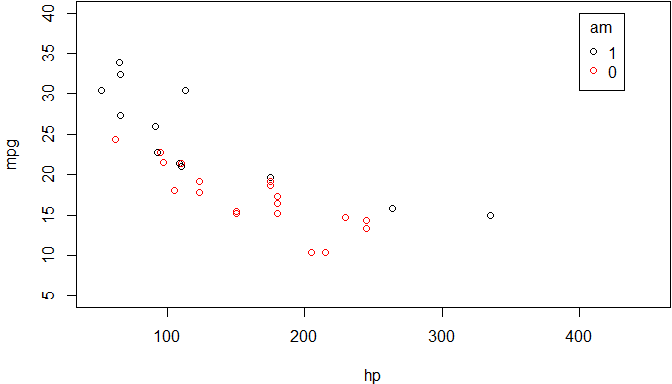 > legend(400, 40, c("1", "0"), title = "am", col = c("black", "red"), pch = c(1, 1))